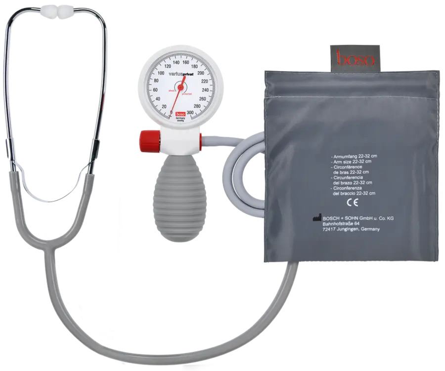 The Boso Varius Privat is a trusted blood pressure monitor crafted for both healthcare professionals and home users. This analog device is celebrated for its high level of precision and easy manual operation, offering consistent readings without the need for digital screens or app connectivity. The Boso Varius Privat brings German engineering to the traditional aneroid sphygmomanometer, giving you clinic-level control in a compact, travel-ready kit. Its shock-shielded 60 mm dial and corrosion-free movement deliver ±3 mmHg accuracy you can trust, even after the occasional bump. A single hose keeps setup tidy, while the built-in stethoscope captures Korotkoff sounds clearly for precise systolic-diastolic identification.